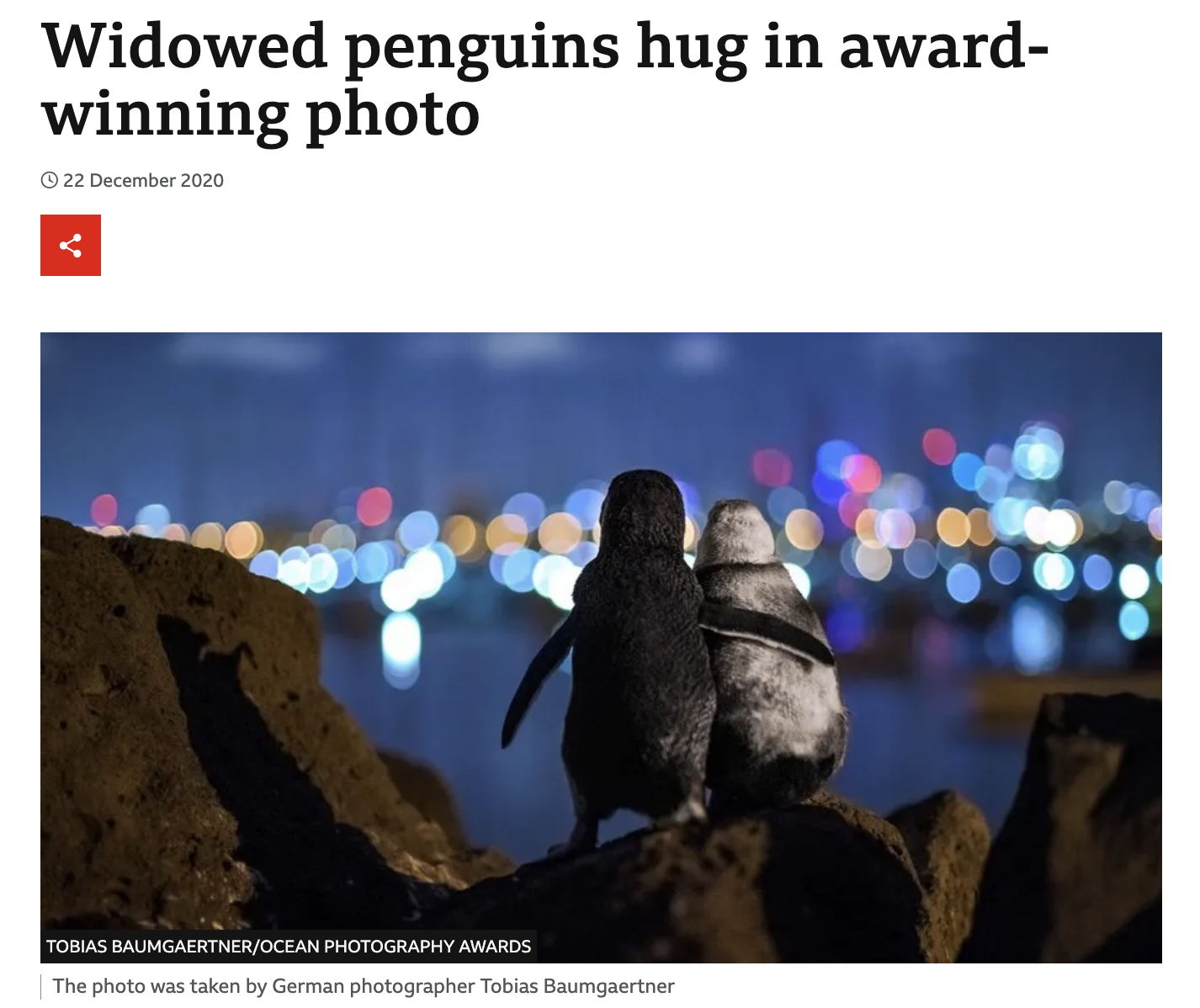 Hi there,我是 Min!這篇我想跟你分享可以如何深入英文的閱讀,同時推薦 BBC 這一篇喪偶(widowed)企鵝互相撫慰的小巧短文,標題是 Widowed Penguins Hug in Award-winning Photo。